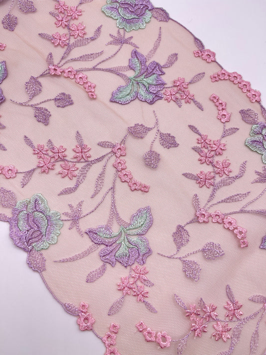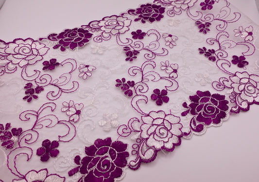 Purple Florals Scalloped - Embroidered Tulle Lace 1 Meter (mirrored)