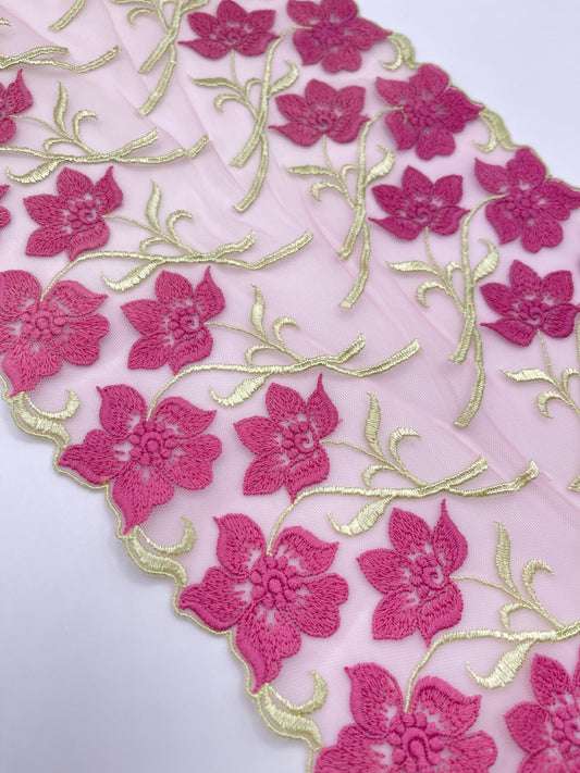 Hot Pink Yellow Flowers - Embroidered Tulle Lace 1 Meter (mirrored)