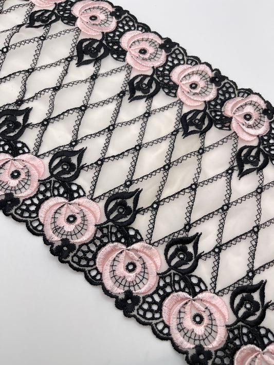 Black Pink Roses - 1 Meter Embroidered Tulle Lace