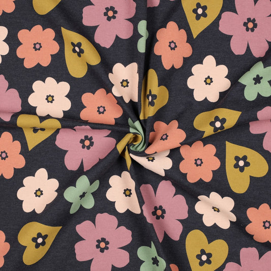Jersey Melange Hearts And Flowers - INDIGO - Poppy Fabrics