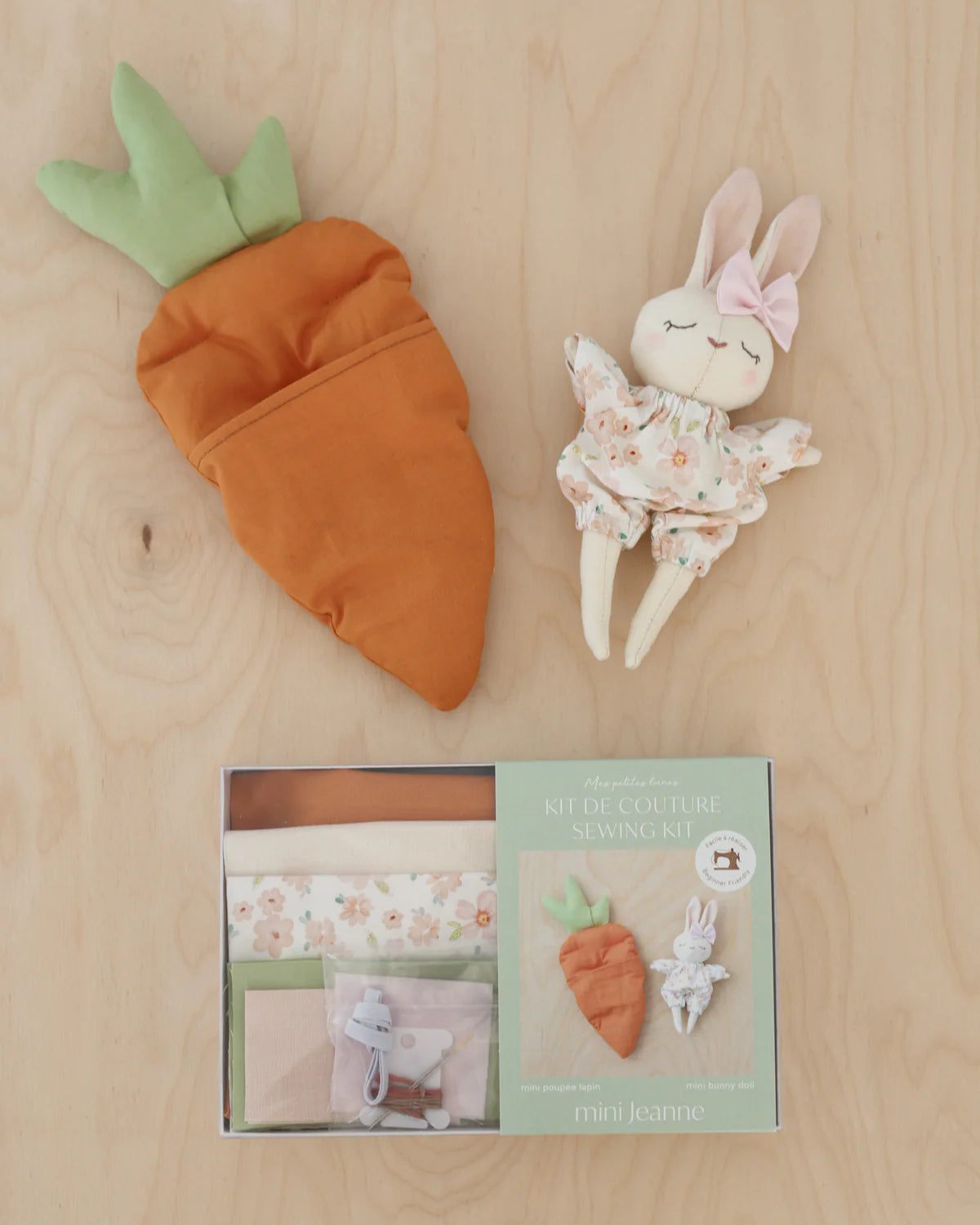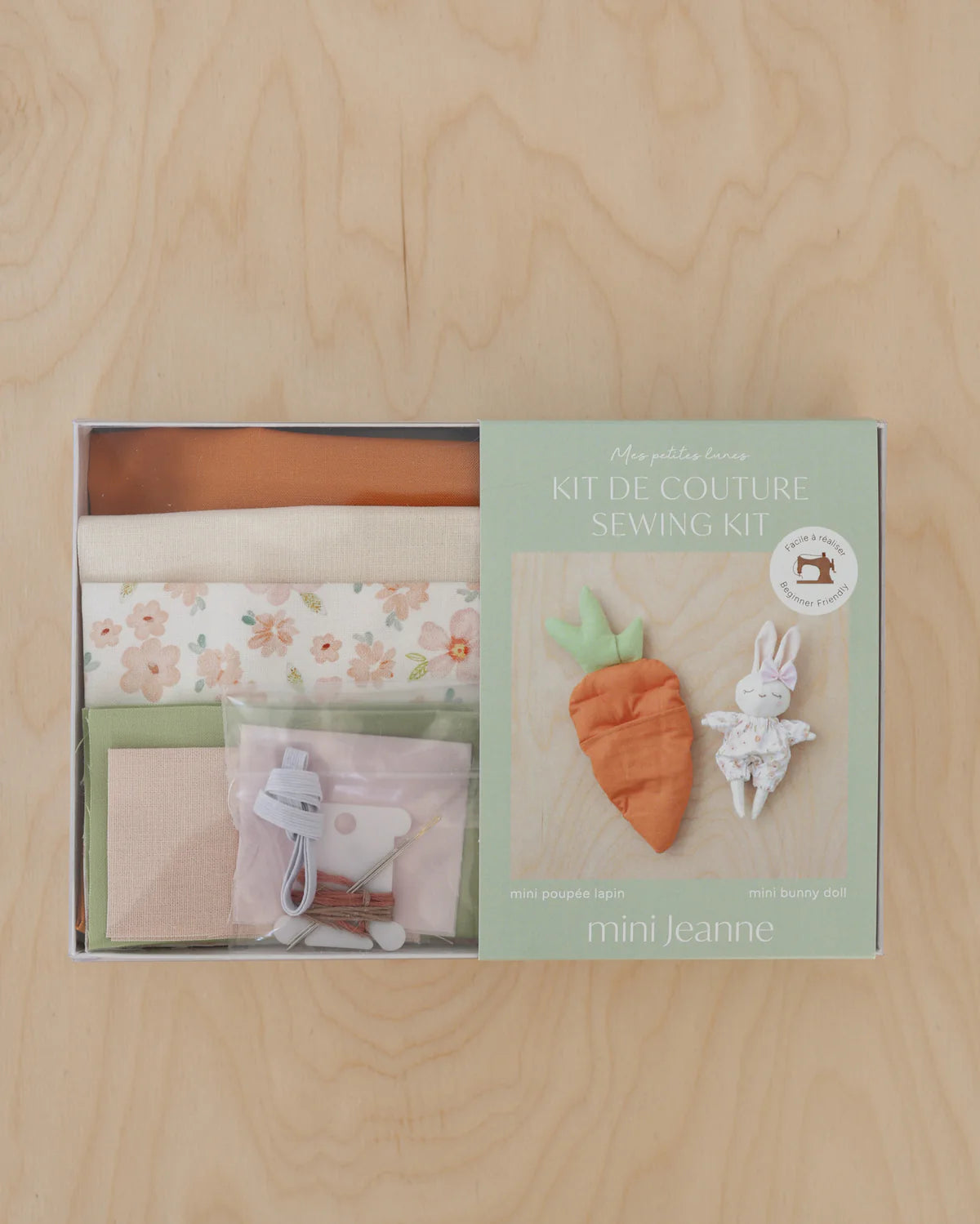 Réalisez votre propre mini lapin Mes Petites Lunes avec ce kit de couture facile, étape par étape ! À l’intérieur, vous trouverez tout le nécessaire pour confectionner une adorable mini peluche de 6 pouces (15 cm), une jolie barboteuse et une boucle, dormant paisiblement dans un lit douillet en forme de carotte. Des aiguilles au tissu en passant par le patron imprimé, chaque détail est inclus dans cette boîte pour rendre votre expérience de couture fluide et agréable.