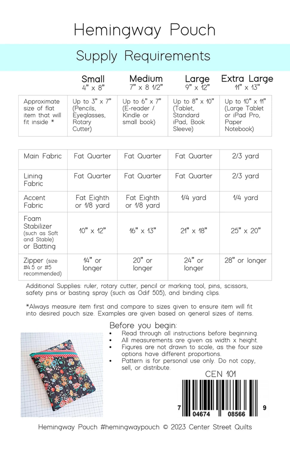 Hemingway Pouch Pattern - Center Street Quilts