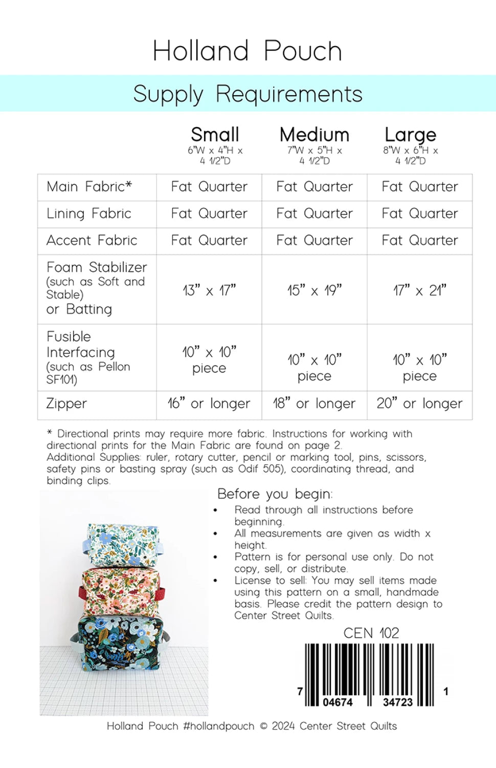 The Holland Pouch pattern is a quilted boxy pouch pattern with three size options, each of which only uses three fat quarters of fabric! The inside of the Holland Pouch is completely finished with all raw edges covered by binding (cut on grain, not bias binding) and no curved seams to sew. The pattern includes full color, step-by-step graphics walking the reader through every step of creating the pouch, plus extra instructions for using directional fabric.
